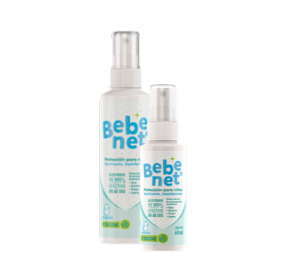 - Bebenet®️ tiene toxicidad e irritabilidad cero y una efectividad de 99.99% contra virus y bacterias. No reseca ni irrita mientras los protege sin dañar.
