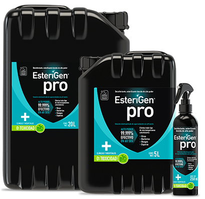 - Esterigen® Pro, para clínicas y hospitales, presentación de 5 Litros en envase negro que protege la solución de los rayos UV evitando su degradación y garantizando la efectividad del producto.